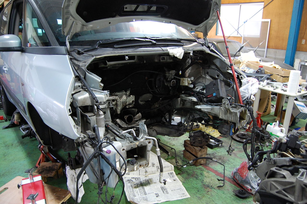 今時の日本車は、エンジンと足回りが一緒にフロントのメンバーに取り付けてあるのが多いみたいで、その場合は、フロントアクセルごと全部外せるようになっているんですが、エスパスは残念ながら、、、というか、きっと性能や軽量化のために!!そういう安直な仕様になっていません!