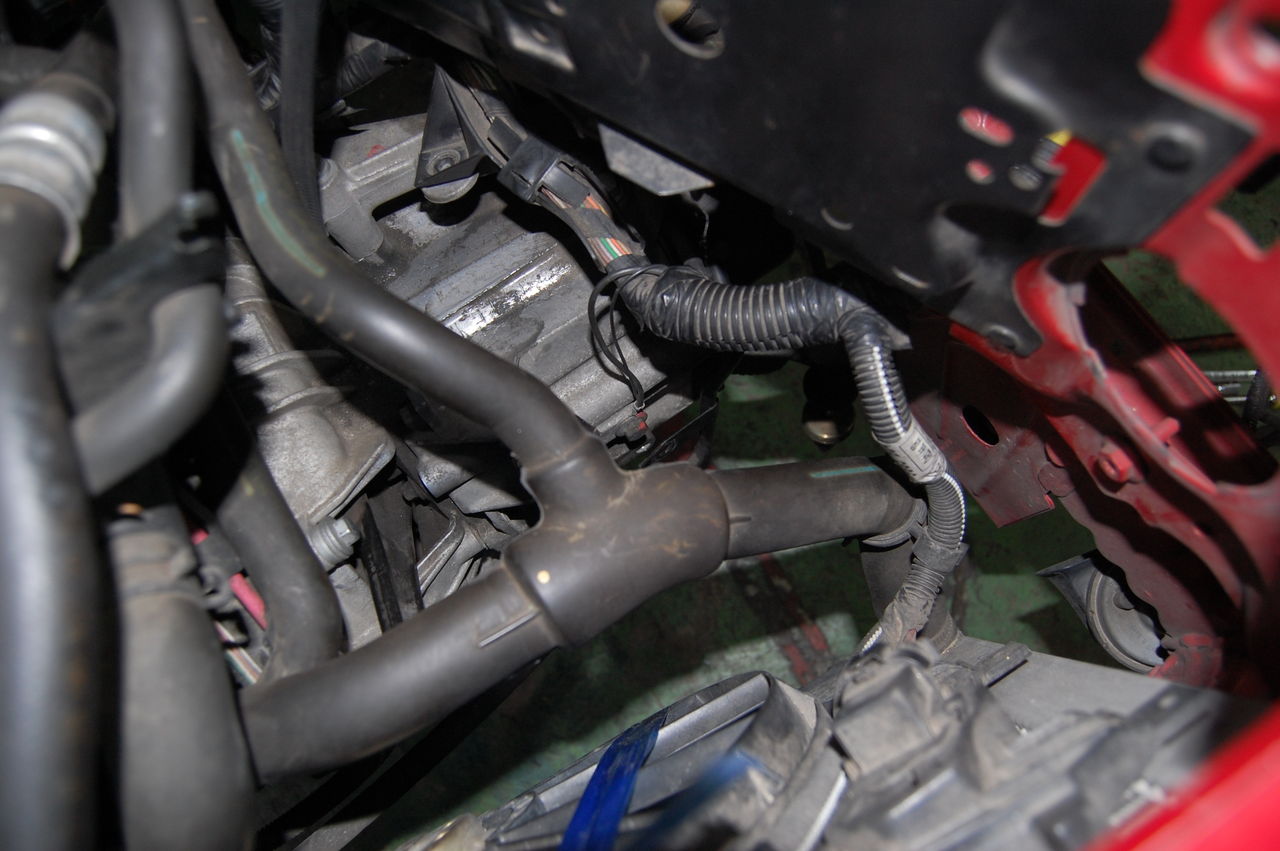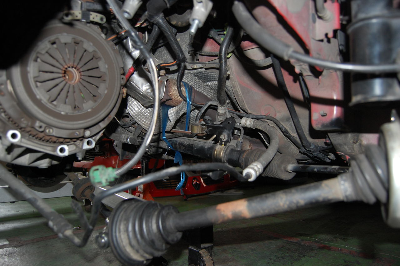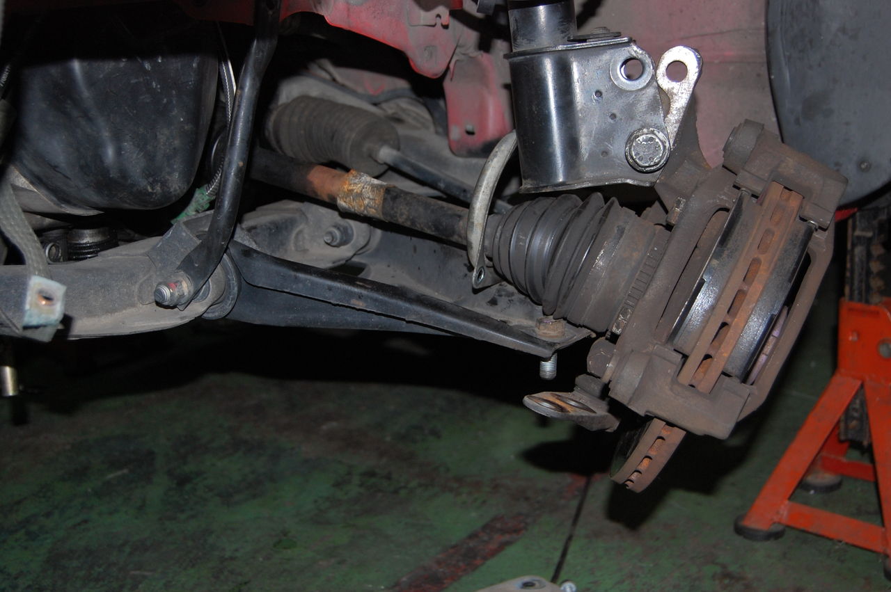 ちなみに周りは、ぶらさげたままのドライブシャフトやパワステホースなどがそのままになっている状態。