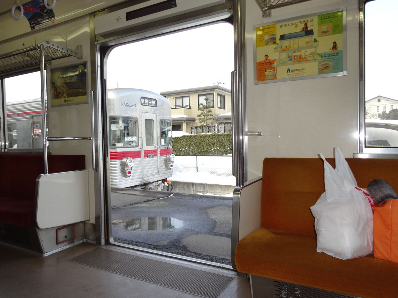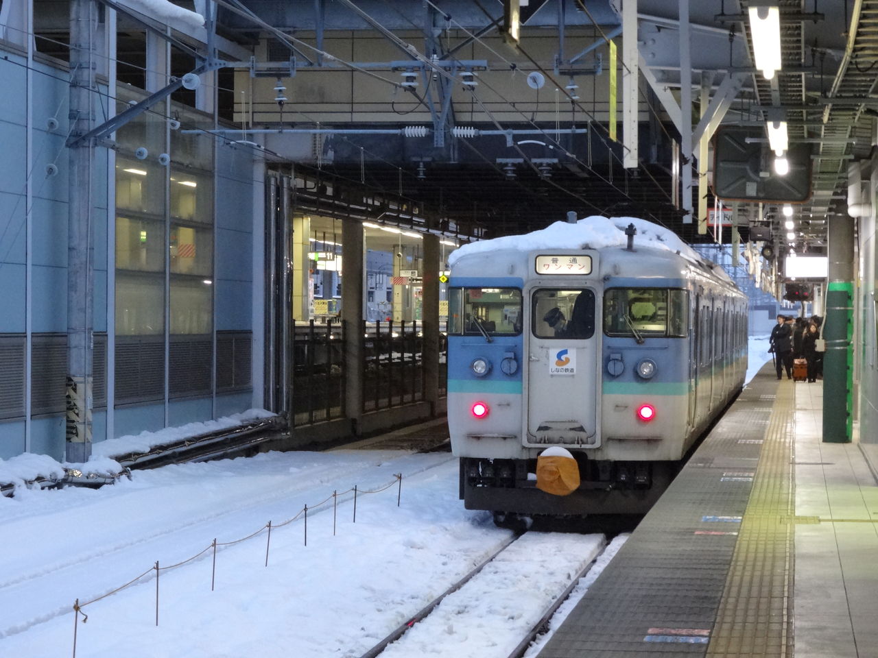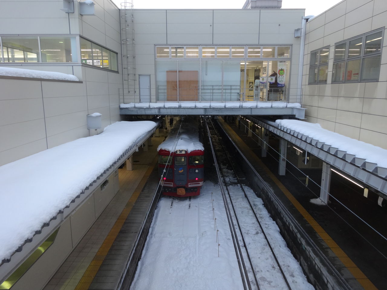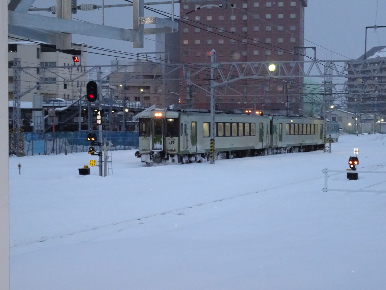先行列車が除雪と点検をしながら走っているとのことで、予定の無い駅で一旦停止して青信号を待つんですけど、、、