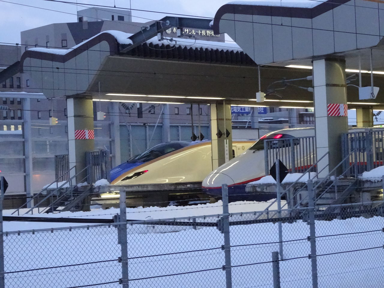 あ〜、新幹線も止まっちゃってたいへんだ〜とか思いながら、格好良い並びを撮ったんですけど、この奥の車両は、まだテスト運航中のE7系という新型新幹線だったんです!